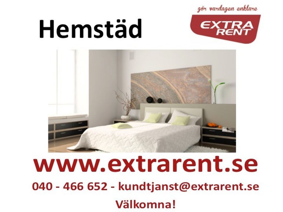 Välkommen till Extra Rent! Tänk att få komma hem till ett nystädat och väldoftande hem utan att du har behövt lyfta ett finger! Vi sköter din hemstädning, fönsterputs och du får mer tid över till roligare saker. Säkerhet är ett av vårt företags ledord. Att kliva in i människors hem kräver en hög dos av respekt och förtroende. Att anlita ett seriöst städföretag som betalar personalen avtalsenliga löner och gör ett proffsigt jobb känns rätt för alla. Utbildad och pålitlig personal resulterar i en grundlig och bra utförd städning. Med flera års erfarenhet inom städbranschen håller vårt namn på att växa sig starkt i vår region. Du kan vara säker på att din städning kommer ske på ett säkert, kostnadseffektivt och på ett trivsamt sätt. Gör din vardag enklare med städhjälp från Extra Rent! Extra Rent erbjuder tjänster såväl för dig som behöver regelbunden hjälp som för ett enstaka tillfälle. Genom att kontakta vår kundtjänst kan du boka in ett enstaka städtillfälle eller starta ett abonnemang. → Hemstäd Tänk att komma hem till ett nystädat hem, vecka efter vecka efter vecka ... Så kan tillvaron se ut om du börjar abonnera på våran hemstädning. I vår hemstädning ingår städning efter en checklista som bygger på ett brett urval av prioriterade städområden i hemmet. → Storstädning Ibland kan det vara skönt att städa lite extra, vi har därför tagit fram tjänsten storstädning. I tjänsten ingår städning efter en mer detaljerad checklista som innefattar områden som ofta bortprioriteras vid vanlig hemstädning. Tjänsten utförs efter konsultation av prioriteringsordning med dig. → Fönsterputs Att putsa fönster kan vara både svårt och tidskrävande, är du Extra Rent kund kan du alltid ha nyputsade fönster utan ansträngning. Vår personal utför denna tjänst i samband med annan städning. Man kan generellt räkna med att lägga på en timma av den beräknade arbetstiden. → Flyttstädning Unna dig en flyttstädning och få tid över till allt annat viktigt i samband med flyttningen. Vi garanterar hög kvalité och ett godkänt resultat, full garanti ingår. Extra Rents flyttstädning tål hårt kritisk och granskning av besiktningsman. → Kontorsstädning Skräddarsydda och flexibla lösningar till företag som vill ha hjälp med städning. Vi ger våra kunder den välstädade miljö dom förväntar sig - på köpet ökar trivseln du på arbetsplatsen. Vårt mål är att våra kunder alltid ska vara 100% nöjda!